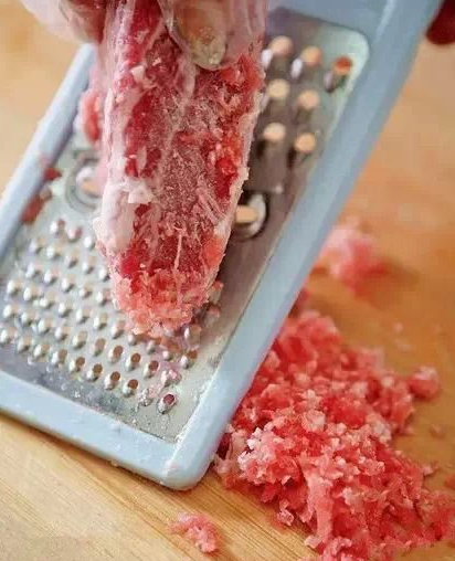 现在就告诉大家一个小窍门——无须将肉解冻就可以做成肉馅!方法是将取出的冻肉,用擦菜丝的擦子擦成细末,就是肉馅了。擦子快速自制肉陷