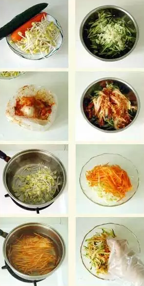 黄豆芽250克,黄瓜1根,胡萝卜1根、辣白菜250克,蒜3瓣
