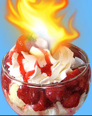 制作方法:如家有烤箱,自制火烧冰淇淋并不复杂。取长蛋糕(或面包)1只,按5毫米厚度,取数片备用片(大小以能紧包住冰砖为适)。干净碗内放入鸡蛋清4只,加白糖少许,搅打直至起泡。另取长盆一只,居中垫蛋糕一片,放入冰砖,把其余蛋糕包紧冰砖,倒入蛋清裹匀。再取半只鸡蛋壳放于蛋清上,进烤箱烤制约半分钟后取出,在蛋壳内注入郎姆酒或白兰地酒25克(高度优质白洒也可),点燃上桌,捞出蛋壳,便可食用。