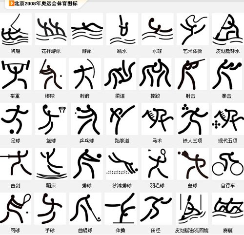 北京2008年奥运会体育图标以篆字笔画为基本形式,融合了中国古代甲骨文、金文等文字的象形意趣和现代图形的简化特征,符合体育图标易识别、易记忆、易使用的要求。强烈的黑白对比效果的巧妙运用,使北京奥运会体育图标显示出了鲜明的运动特征、优雅的运动美感和丰富的文化内涵,达到了“形”与“意”的和谐与统一。