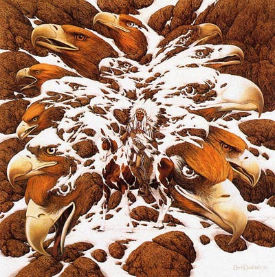 你看到很多鹰的头像?没错,是很多。那么,你看到中间骑马的印第人吗?