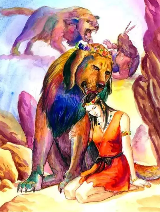 盘瓠(hù),中国古代神话中的人物。传说远古高辛帝时,“时帝有畜狗,其毛五采,名曰盘瓠”。因戎吴将军作乱,高辛答应谁能斩下吴将军之首级,就能封邑赏金,把公主嫁给他。盘瓠咬下吴将军首级而归。后“帝不得已,乃以女配盘瓠”。盘瓠死后,“其后滋蔓,号曰蛮夷”,成为中族,大家都尊奉他们共同的祖先。这个故事在我国南方瑶、苗、黎族民族中也广为流传,据说那时原人民都非常虔诚地祭祠盘王。后“盘瓠”音转为“盘古”,成为中华民族的祖先。