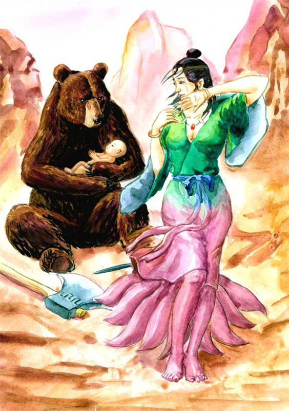 涂山氏,大禹之妻,传说为九尾狐狸精。中国上古神话中,夏族的始祖神为涂山氏,夏族就是日後建立中国第一个王朝夏的一个部落集团。据《淮南子》记载:"禹治洪水,凿轘辕开,谓与涂与氏曰:'欲饷,闻鼓声乃去。'禹跳石,误中鼓,涂山氏往,见禹化为熊,惭而去。至嵩山脚下化为石,禹曰:'归我子!'石破北方而启生。"女娇,涂山氏的女儿,禹妃子。