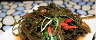 制法: 将海带洗净,切成细丝,放在开水中焯一下捞出控干,撒上精盐、青菜丝拌匀盛盘,最后放上葱、姜,倒上醋,椒油加热炝上即成。丝长味香,别有风味。