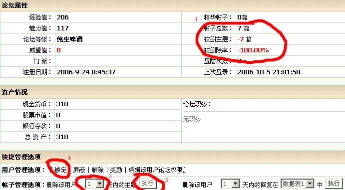 如图三的注解1所示,该用户已发了14贴广告了,你可以点击注解2:删除该用户1天内的主题,点执行