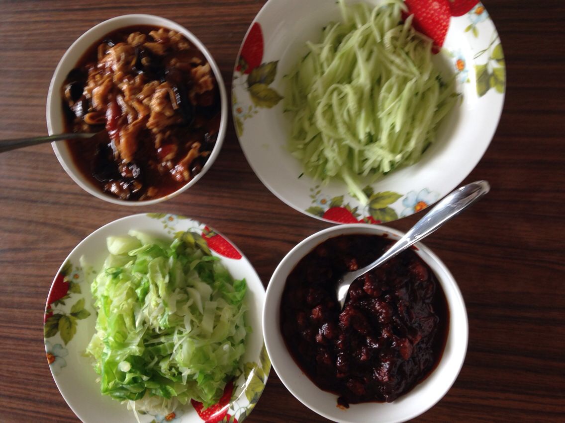 做好以后的西红柿卤,炸酱,圆白菜丝煮熟,再加点黄瓜丝