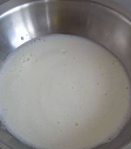 清也有技巧,蛋壳敲一个缝,让蛋清慢慢漏到碗里。冷却好的牛奶轻挑奶皮,把小碗牛奶全部倒入有蛋清的大碗里。牛奶倒完,奶皮就沉在碗底,千万不要把奶皮弄破。把蛋清和牛奶搅拌在一起,打匀,再