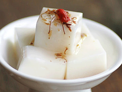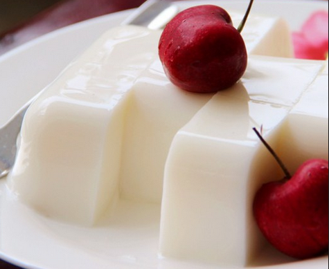 3.杏仁豆腐切块,淋上焦糖即可。