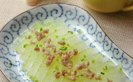 3、将冬瓜片放入盘中铺平,将腌好的肉末铺在冬瓜上,放入蒸锅里,用中火蒸8分钟至冬瓜熟透;
