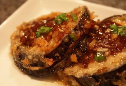 3、平底锅烧热,倒入油,将茄子片裹上面糊,放入锅里,煎至两面金黄,茄子瓤熟软即可出锅;