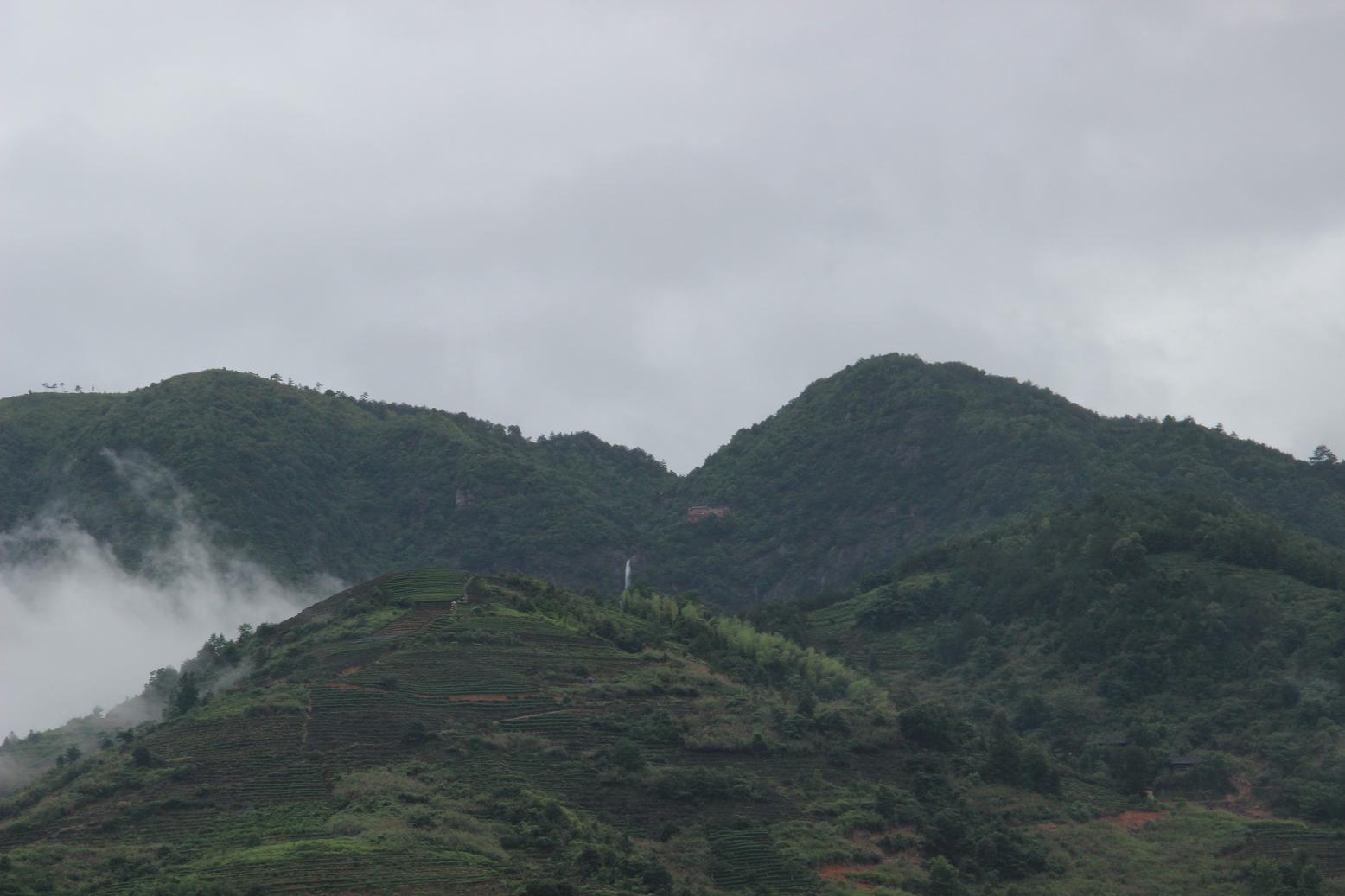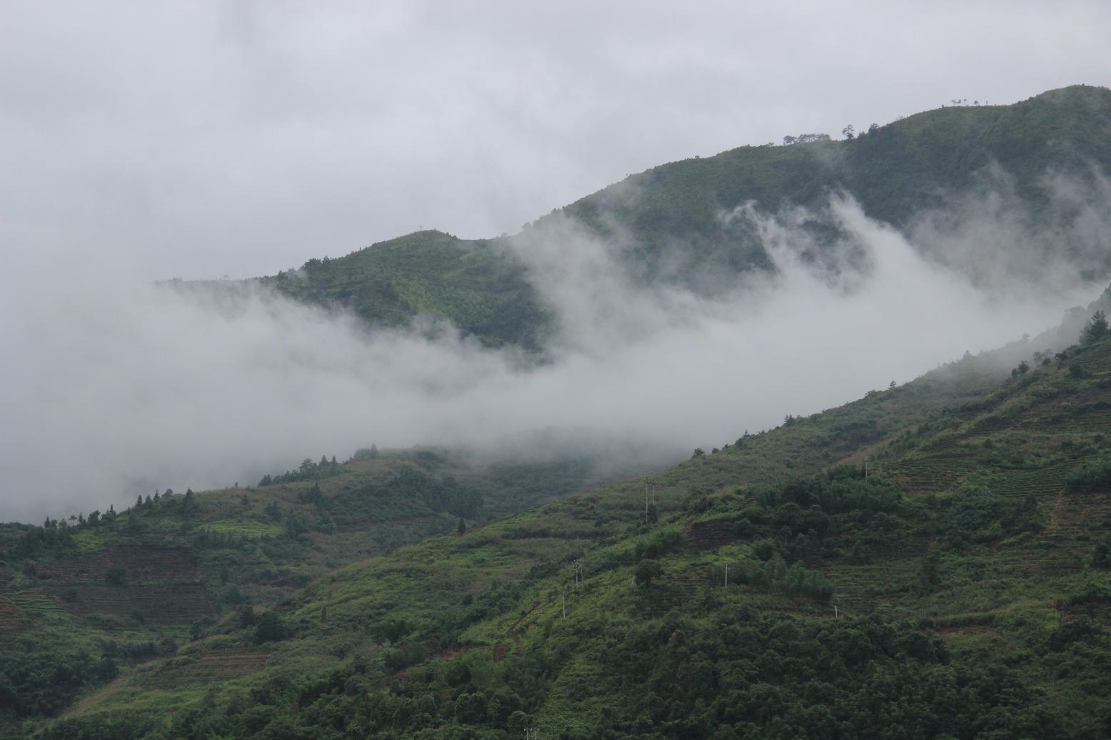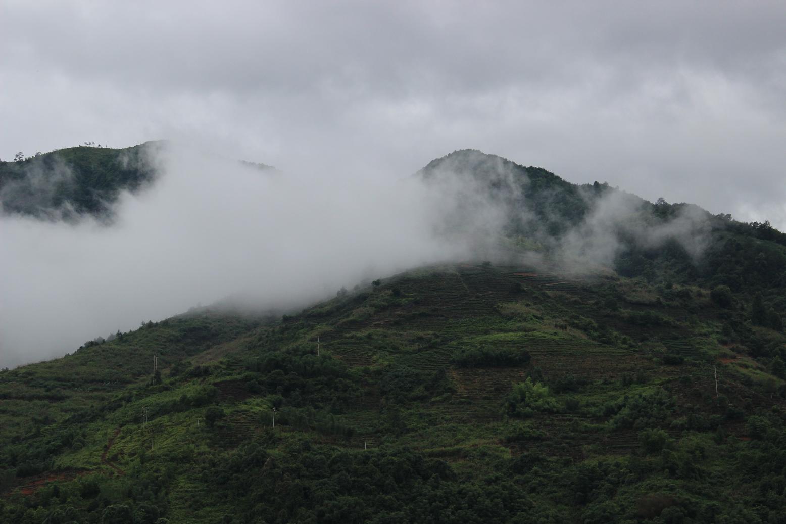 下雨天,山上有很多云雾,漫山遍野一边翠绿,别有一番情趣。