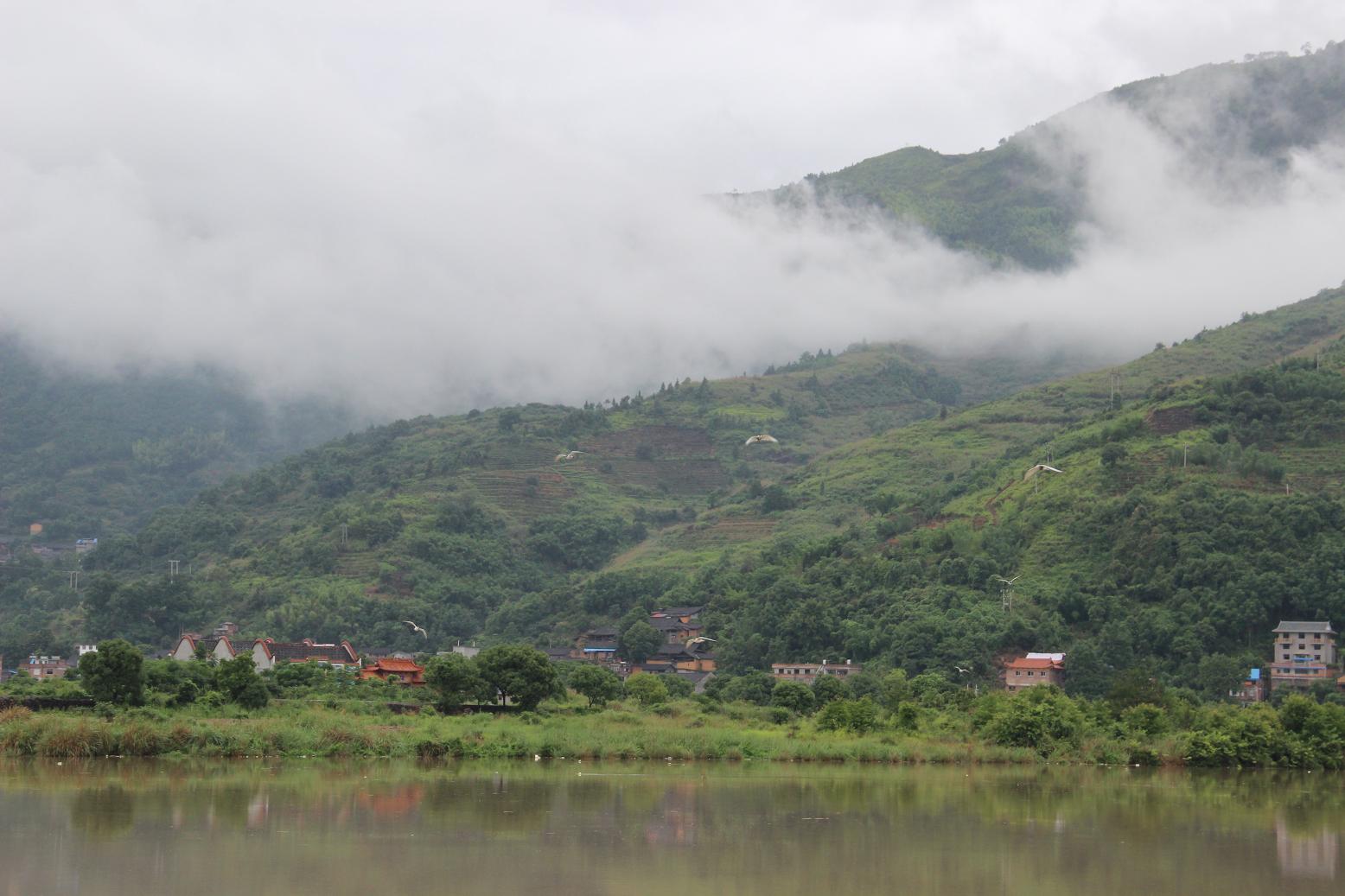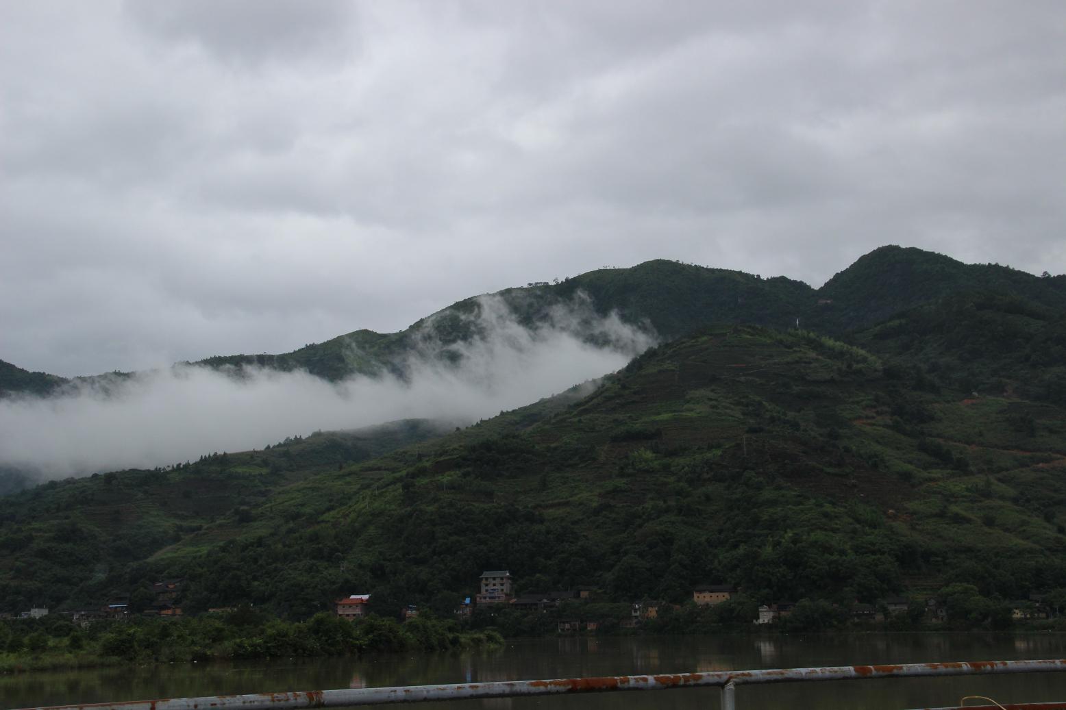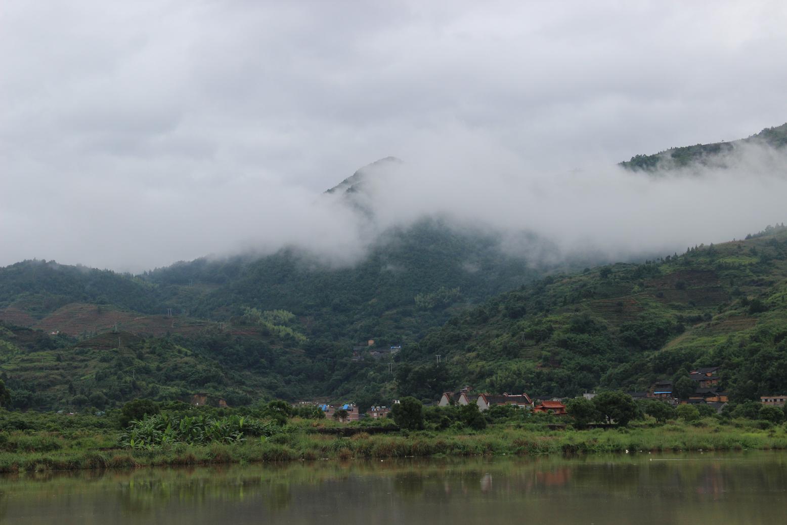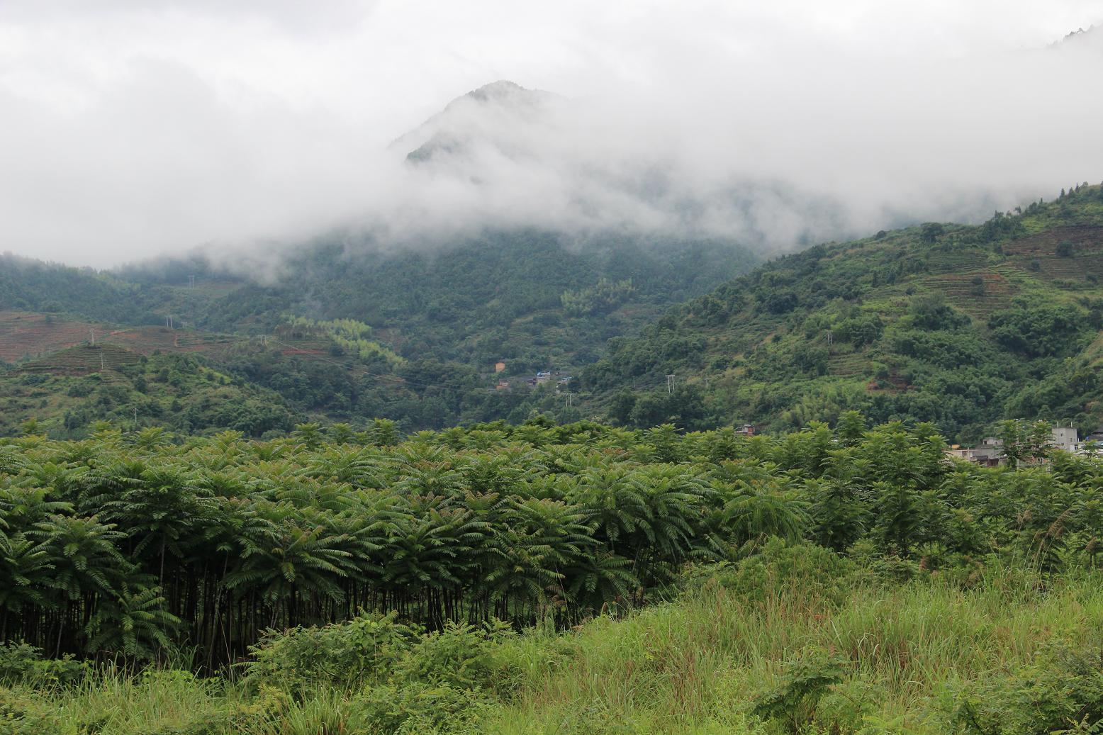 下雨天,山上有很多云雾,漫山遍野一边翠绿,别有一番情趣。