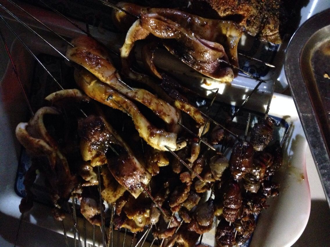 这一盘子,有烤鱿鱼,烤蚕蛹,烤蚕,看着那个蚕和蚕蛹,决定恶心
