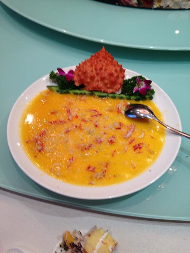 帝王蟹,蟹肉掏出和鸡蛋蒸熟像鸡蛋羹,味道极佳,蛋羹里有着抵御不了的帝王蟹的鲜味,那味道一个字“爽”。