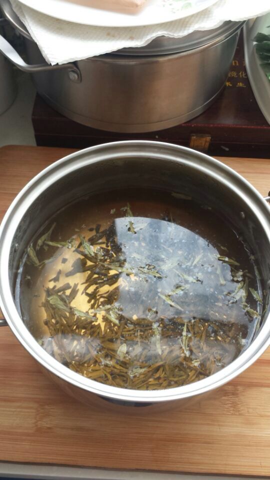 把虾洗净,去掉虾脚,葱,姜,蒜切块,茶用水泡开,国内放少许底油,然后放入整理好的虾,淋入海鲜酱油,加盐,翻炒,最后放入沥干水分的茶,最后收汁。(喜欢吃甜食的可以加一点点糖)