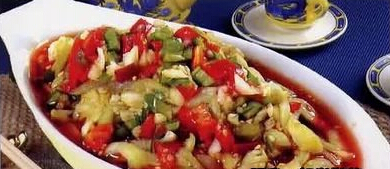 制法:将葱头剥去老皮洗净,直刀切成片,再改刀切成粗丝或小块;辣椒直刀切成丝共装盘内,然后拌上精盐、酱油、陈醋,最后滴上香油,搅拌匀即好。新鲜脆嫩,酸辣适口。
