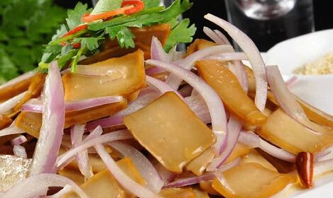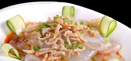 制法:先将猪肉洗净,片成片再切成细丝;粉皮泡软后也直刀切成丝,入开水锅里煮一下,捞出放入凉水里,沥控水分,盛入盘里,用筷子搅散。再将炒锅置旺火上,倒入油烧热,随即将肉丝入锅煸炒,加一钱酱油,待肉色变色盛在粉丝上。浇上醋、香油、芥末、盐水、味精兑成的汁,最好淋上麻酱即成。味香爽口,佐酒佳肴。