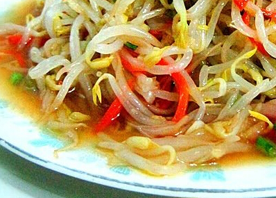 原料:绿豆芽二斤 食盐五钱 椒油五钱 葱丝一钱姜三片 芫荽二棵 醋三钱