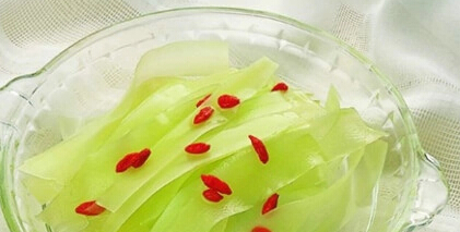 原料:莴笋一斤 黄瓜五两 精盐五钱 红辣椒二两葱一钱 姜三片 醋二钱 椒油五钱