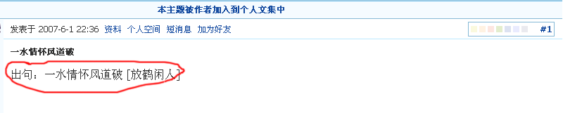 第八步,点击贴子进入后,出现以下界面,那么,我们可以把这个出句:一水情怀风道破 [放鹤闲人]给复制起来,然后拉到网页的最下面